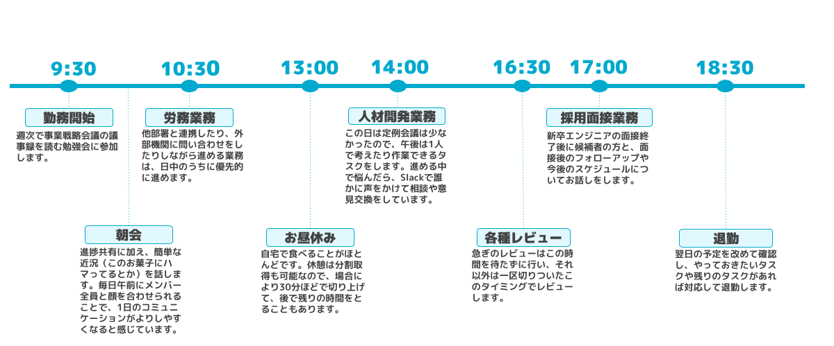また、従業員の勤怠をはじめとした労務管理は、各部署の管理職とも連携が必須ですが、各システムの設定を改善するなどして管理職の工数を削減できたときは、その分管理職がそれぞれの担当業務に集中することができるので、やりがいを感じます。